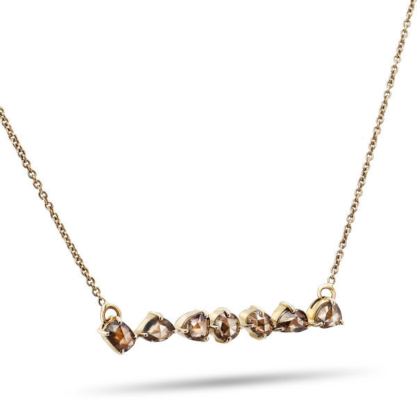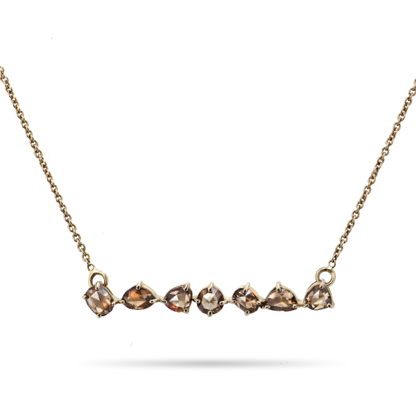 Beautiful one of a kind necklace with varied shapes of coffee diamonds® set in a straight line. Appealing with its subtle glow and artistry, this necklace is perfect for casual and formal occasions. Makes a delightful gift choice too.