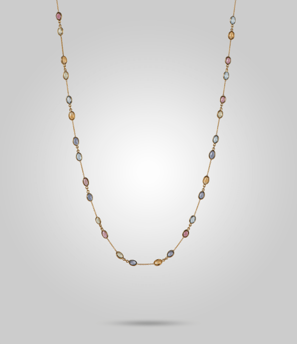 Mesmerising with a medley of gorgeous colours, this dainty gold gemstone necklace has beautifully linked semi-precious gemstones. The coloured gems can inspire, illuminate positive energy and elevate your mood dramatically
