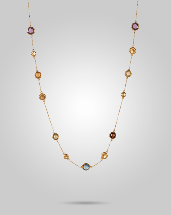Beautifully combining coloured gemstones and circular brushed gold charms, this asymmetrical gold necklace is enchantingly pretty.