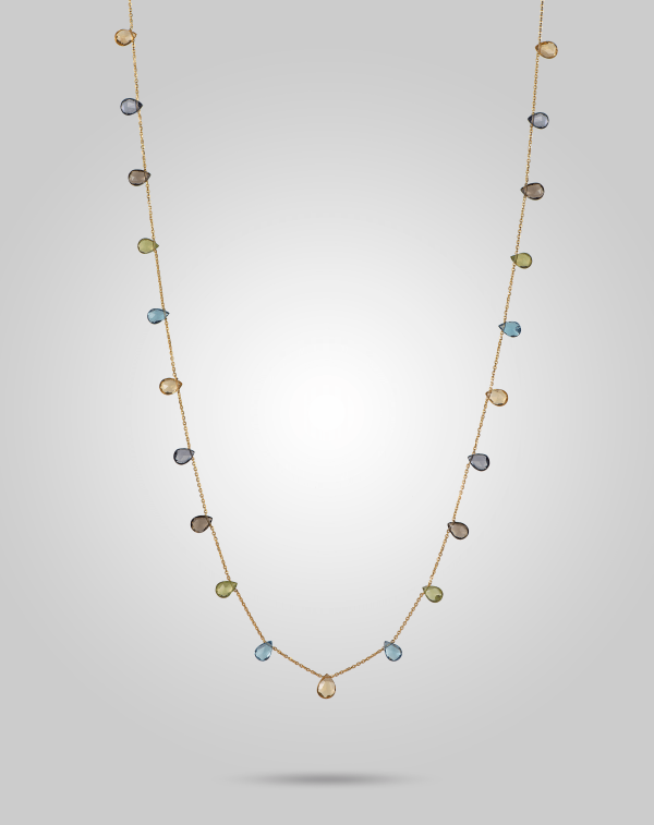 This dainty gold necklace is studded with multi hued gemstone drops, and colours your world with incredible elan! Contemporary chic for the beautiful you!