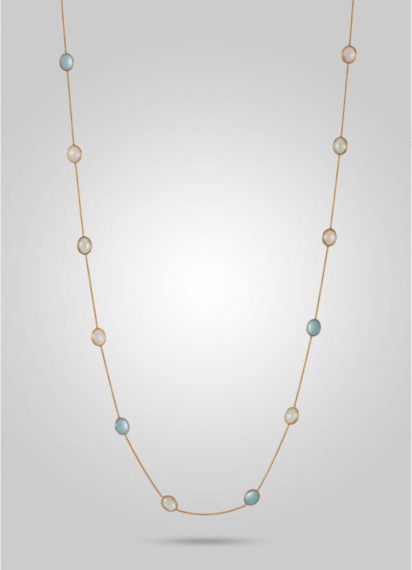 Spell timeless chic, as you adorn this long gemstone necklace twinkling merrily with a beautiful amity of pastel aquamarine, prenite and rose quartz gemstones.